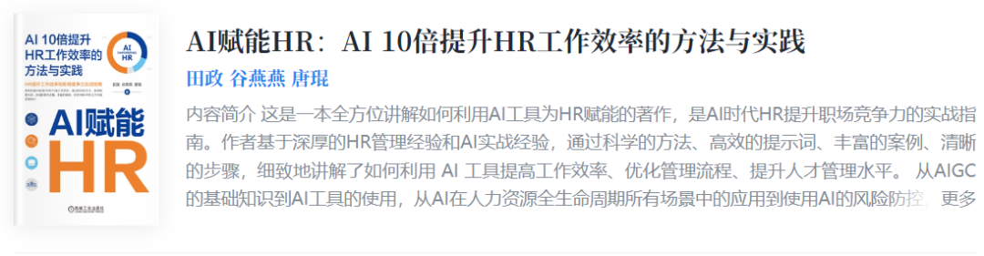 本内容节选自机械工业出版社《AI赋能HR——AI 10倍提升HR工作效率的方法与实践》 作者:田政、谷燕燕、唐琨 在当今时代,人工智能(AI)浪潮席卷全球,其迅猛发展深刻影响了各行各业。尤其在人力资源行业,AI的价值早已不再局限于提升效率,更在人力资源战略制定的各个阶段发挥着重要作用。 从环境分析到人才需求预测,从员工培训到绩效评估,AI能为企业提供高效、精准的服务,帮助企业制定更有效的策略,实现更高效的人力资源管理。 AI在需求预测中的应用 传统的预测方法往往依赖于经验判断,缺乏数据支撑,难以准确预测未来的人才需求。AI的出现,为我们带来了数据驱动的全新预测模式。 1.操作步骤 步骤1:数据收集与整理 AI的预测能力依赖于大量数据的训练和分析,如果没有高质量的数据,AI 将无法进行有效的预测。只有收集到足够的数据。才能为AI提供“学习”素材,让它建立起对企业和行业的理解,从而进行更准确的预测。 我们需要收集过去三年的招聘数据(岗位、数量、渠道、薪资)、员工绩效记录、离职率数据、薪资数据等,并将数据整理成结构化的表格或文件,方便AI 进行分析。 步骤2:目标设定 预测的目的在于为企业未来的发展提供人才保障。没有目标,预测就失去了方向,无法为企业提供实际的指导。在了解数据的基础上,只有明确企业目标才能将预测与实际需求紧密结合。 步骤3:AI分析 将整理好的数据和企业目标输入AI,根据我们需求,可以使用以下提示词: 请根据以下数据和目标,分析未来三年的人才需求趋势。 请预测未来三年,哪些岗位的人才需求量会增加? 请分析未来三年,哪些技能是核心竞争力,需要重点培养? 利用AI提供的趋势分析、预测模型等功能,对数据进行深入分析,并解读分析结果。 步骤4:策略制定 基于AI提供的分析结果,制订招聘计划、人才发展策略,包括确定招聘的时间表、确定目标招聘渠道、调整薪资待遇、增加特定技能人才的招聘,或者为现有员工提供培训和职业发展机会,以弥补技能缺口等。 这4步是AI助力人力需求预测的关键步骤,但并非最终保证。最终的预测结果和策略制定仍然需要结合实际情况进行判断和调整。 以上操作中,需要特别注意: 请根据以下数据和目标,分析未来三年的人才需求趋势。 请预测未来三年,哪些岗位的人才需求量会增加? 请分析未来三年,哪些技能是核心竞争力,需要重点培养? 2.示范案例 案例背景: 这是一家致力于人工智能软件开发的互联网科技公司,目标是扩如何用AI工具预测未来三年AI人大市场份额,提高产品质量,推出新产品线。 如何用AI工具预测未来三年AI人才需求? 步骤1:数据整理 以下是整理好的一些相关数据: a.历史招聘数据 2021年:招聘AI工程师10人,数据科学家5人,产品经理3人,市场营销人员2人。 2022年:招聘AI工程师15人,数据科学家8人,产品经理5人,市场营销人员4人。 2023年:招聘AI工程师20人,数据科学家12人,产品经理7人,市场营销人员6人。 招聘渠道:校园招聘、猎头公司、在线招聘平台。 离职率:2021年5%,2022年8%,2023年10%。 b.员工绩效记录 2023年绩效评估:AI工程师团队整体优秀,数据科学家团队表现良好,产品经理团队表现一般,市场营销团队表现良好。 升职记录:2023年有3名AI工程师晋升为高级工程师,1名数据科学家晋升为高级数据科学家。 项目成果:2023年成功发布2个AI产品,市场反响良好。 c.行业数据: AI人才市场竞争激烈,优秀人才供不应求;AI相关技术快速发展,对人才技能要求不断提升。 d.政府政策: 鼓励AI产业发展,为AI人才提供各种支持。 步骤2:目标设定 明确公司未来三年目标,如推出3个新的AI产品,拓展海外市场;扩大AI 研发团队规模,提升产品质量。 步骤3:AI分析 将以上整理好的数据和企业目标输入AI,并根据需要附上提示词,例如: 请根据提供的招聘数据、员工绩效记录、行业数据和公司目标,预测未来三年AI人才需求趋势。 未来三年,哪些岗位的人才需求量会增加? 未来三年,哪些技能是核心竞争力,需要重点培养? 哪些岗位的员工流失率较高,需要制定相应的留任策略? AI根据提示词可能会给出以下建议: a.未来三年,AI工程师、数据科学家、产品经理的人才需求量将会持续增加 b.未来三年,核心技能将包括: AI算法开发:深度学习、机器学习、自然语言处理等。 大数据分析:数据清洗、数据挖掘、数据可视化等。 产品设计:用户体验设计、产品策略、产品运营等 c.未来三年,AI工程师和数据科学家的流失率可能会继续上升,主要原因是: 行业竞争激烈,人才流动性高。 薪资待遇竞争力不足,人才容易被其他公司挖走。 步骤 4:策略制定 根据AI的建议,我们可以整理出如下策略: a.招聘计划 增加AI工程师、数据科学家、产品经理的招聘数量,并积极寻找优秀人才,例如: 1、扩大招聘渠道,包括校园招聘、猎头公司、在线招聘平台等。 2、提高薪资待遇,吸引优秀人才。 3、加强品牌宣传,提升公司吸引力。 b.人才培养计划 重点培养员工的AI算法开发、大数据分析、产品设计等核心技能,例如: 1、制订专门的AI技能培训计划,邀请行业专家进行授课。 2、鼓励员工参加 AI相关的专业认证考试。 3、为员工提供学习和实践的机会,例如参加项目开发、参加学术会议等。 c.留任策略 制定留任策略,降低 AI工程师和数据科学家的流失率,例如: 1、提高薪资待遇,提供更具竞争力的福利。 2、